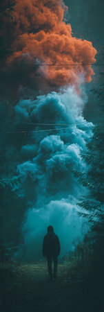 Man standing in the middle of a forest and looking at the smoke.