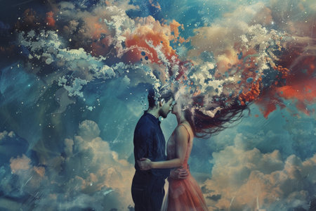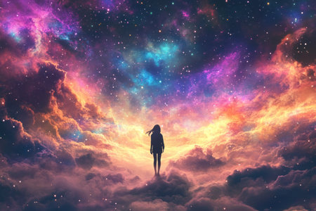 A girl stands in the center of an endless nebula, surrounded by colorful clouds and stars. The sky is filled with bright colors like purple, blue, pink, orange, yellow, and red, creating a dreamy atmosphere that seems to come from another world. Her silhouette appears small against such vast space, as if she has become part of it. in the style of photography, fantasy style. --ar 3:2 --v 6.1 Job ID: dfd9dfc6-3fa0-4c0c-883a-420ad5caa76c