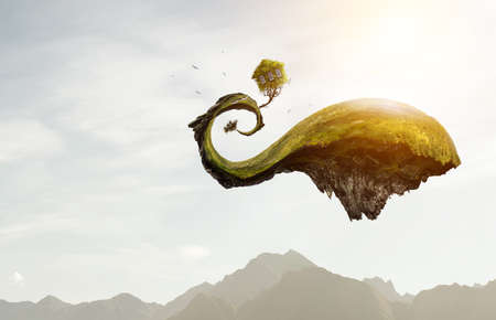 A young man stands on a bridge in the clouds in front of the passage through the magical port. Magical collage.