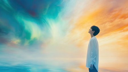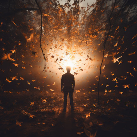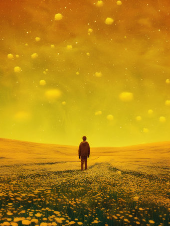 A striking image depicting the silhouette of a solitary figure looking up at the sky in a surreal, ethereal environment. The man stands alone in a mystical landscape, symbolizing introspection