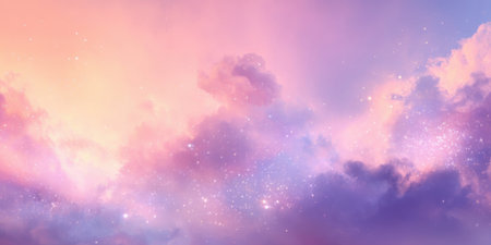Soft pastel colors blend in the sky as the sun sets. Fluffy clouds scatter across the horizon, creating a tranquil and dreamy atmosphere filled with hints of stars.