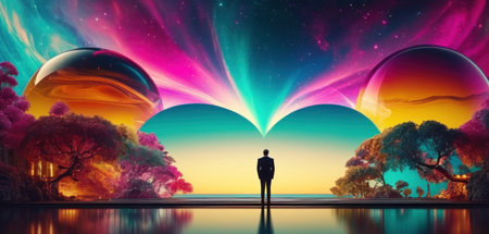 Fantasy landscape with starry sky and silhouette of a man in the water