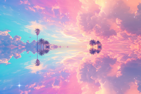 A surreal landscape featuring two trees on a floating island amidst clouds, depicting a dreamlike and serene atmosphere.