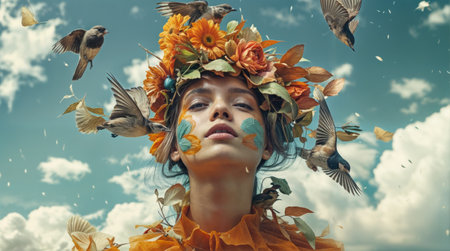 A surreal portrait of a woman wearing a floral crown with birds flying around her, set against a dreamy sky background.