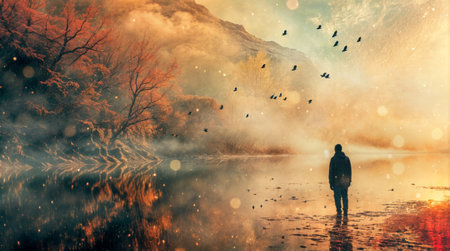 A lone figure stands by a misty lake surrounded by autumn trees, with birds flying overhead, creating a mystical and serene atmosphere.