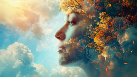 The image shows a beautiful woman with a glowing head made of colorful clouds and autumn leaves. She is looking down at the viewer with a serene expression. The background is a bright sky with fluffy clouds.