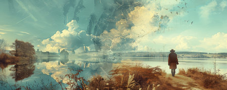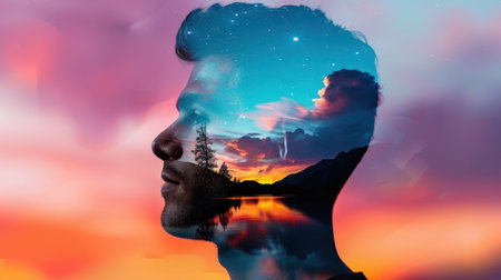 This captivating image features a silhouette profile of a man enhanced by double exposure, merging a breathtaking landscape of a lake, trees, and a dynamic sunset sky, evoking feelings of tranquility and wonder.