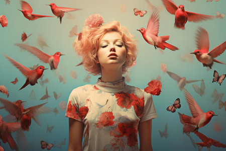 Surreal portrait of a woman with closed eyes among flying red birds on a teal background