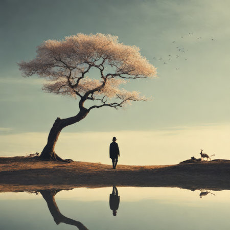 A tree is reflected in the water, with a person standing in front of it. The image has a dreamy, surreal quality to it, with the tree and person appearing to be floating in the water
