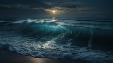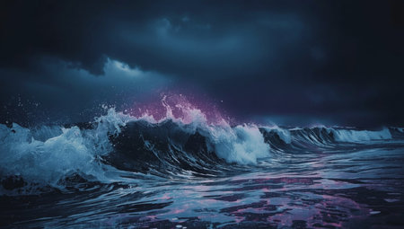 Experience the stunning beauty of ocean waves illuminated by vibrant plankton glow. This surreal image captures nature's wonders in a tranquil, dark setting.