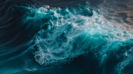 This image showcases a dynamic view of ocean waves, with swirling water patterns and rich textural details. The composition displays various shades of teal and white, suggesting a turbulent environment. Suitable for a range of uses, this photograph could be employed in various commercial and editorial contexts.