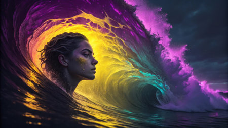 The face is enveloped in a wave of vibrant colors with neon yellows and rich violets flowing through the reflective surface creating a captivating harmony amidst the chaotic.