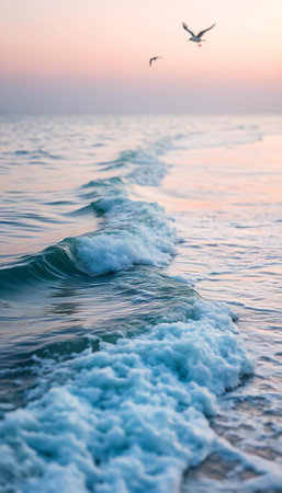 Serene ocean scene captures gentle waves rolling onto shore under pastel sky. soft colors evoke sense of calm and tranquility, perfect for relaxation and reflection