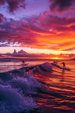 a couple of people riding surfboards on top of a wave in the middle of a body of water with orange and blue clouds in the background and a man standing on a surfboard. .