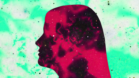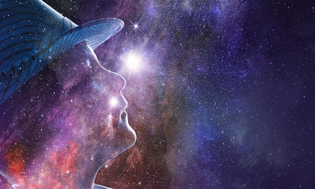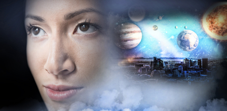 Double multiply exposure abstract portrait of young woman face with galaxy universe space inside head. Human spirit, astronomy, ask question, answer concept