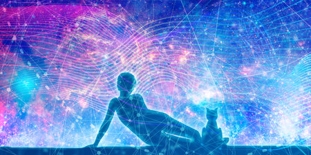 The woman sitting with cat. Elements of this image furnished by NASA. Deep space filled with stars, nebula and galaxy. Cutout silhouettes. images-assets.nasa.gov/image/PIA12348/PIA12348~orig.jpg