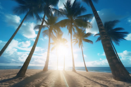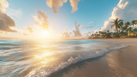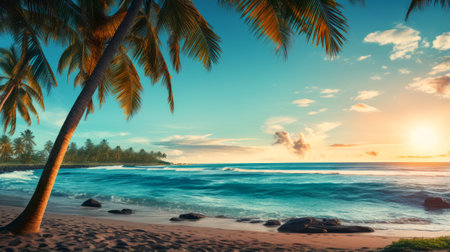 Serene beach scene with gentle waves, sandy shoreline, and palm trees casting shadows. The bright colors and soft brushstrokes create peaceful atmosphere. Generated AI. Sunny beach holidays travel