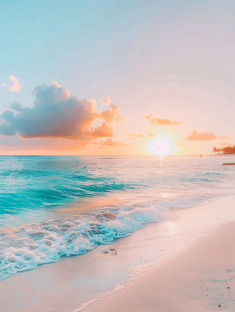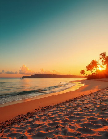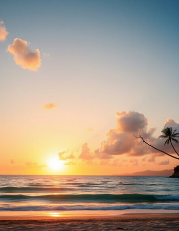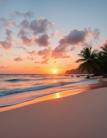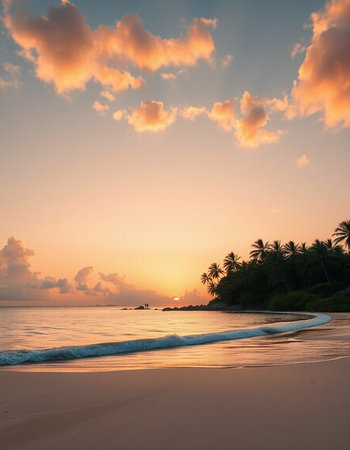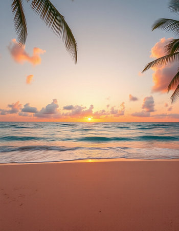 A peaceful sunset on a tropical beach, waves gently lapping against the shore, with palm trees in the background and soft pink clouds in the sky.