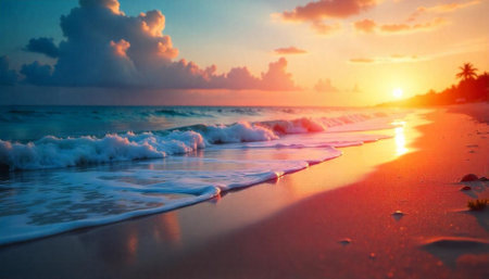 A coastal landscape features palm trees and ocean waves under a colorful sunset. The image displays warm tones from the setting sun, illuminating the water and sky. Suitable for travel or tourism promotions, this scenery could be used to evoke feelings of tranquility or depict natural beauty.