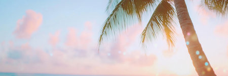 Two palm trees on serene sunset beach with pastel sky, nature background, AI generated