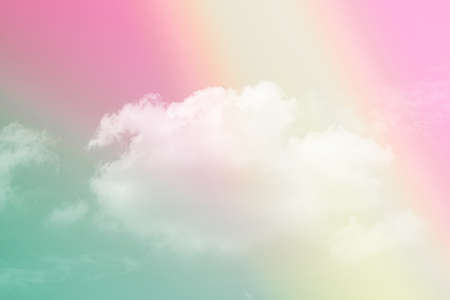 Beautiful pastel color with rainbow shade on white fluffy clouds, colorful blue sky on background, upward view and copy space image