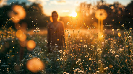 A captivating view of a field bathed in the golden glow of sunset. The sun's rays illuminate the tall grass and wildflowers, creating a vibrant and ethereal scene.