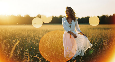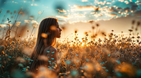 Girl Sitting in Sunny Meadow at Sunset