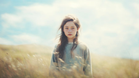 Portrait of a beautiful young woman on meadow. Painting effect.