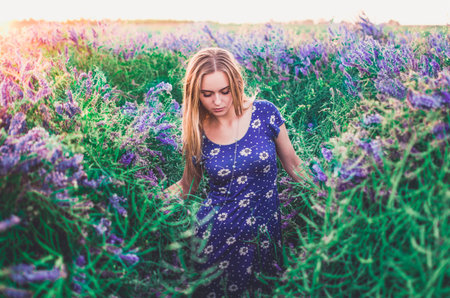 light-skinned European blonde young slim girl walks on tall grass overgrown with purple flowers. Womens blue short skin-tight dress with white daisy print.