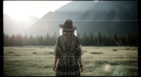 Long haired woman wearing a Bohemian shirt. Stroll in the green grass fields, bright sky.