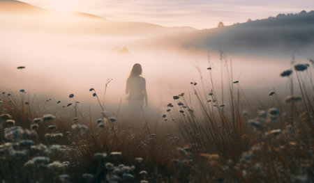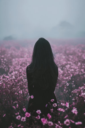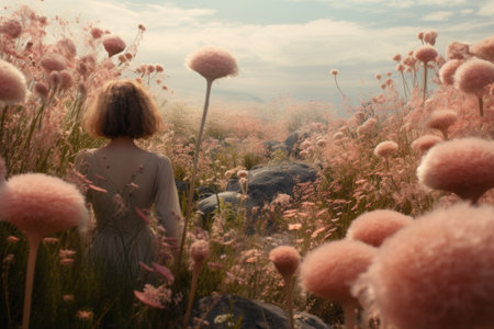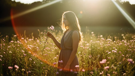 Woman walking through field of wildflowers