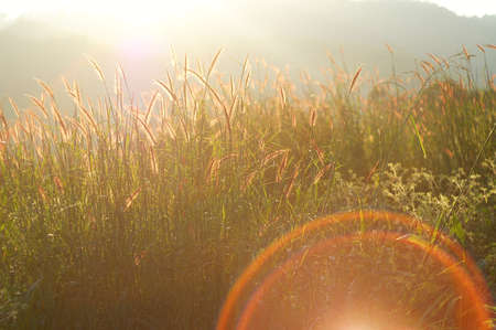 Panorama view, the sun setting through mountains on tropical grassland. Art transparent wild grass in full bloom in springtime. Abstract shadow, sun rays with lens flare.