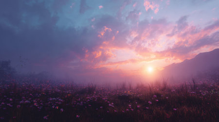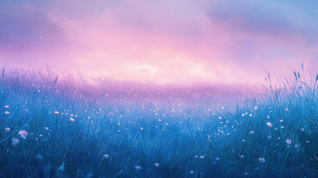A vibrant meadow bathed in the golden light of sunset, showcasing a symphony of wildflowers and lush green grasses. The gentle sunlight creates a soft glow, illuminating the scene with a sense of tranquility and beauty.