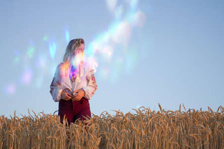 Ukrainian girl in white ethnic embroider shirt. Ukrainian national clothes. Beautiful girl in national ukrainian clothes on the wheat field