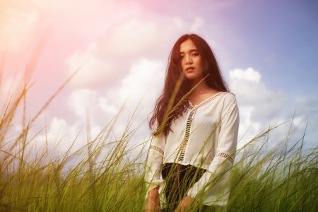 Asian woman is blowing out Grass flower into the wind in nature.