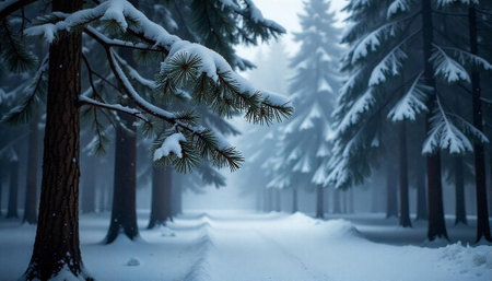 A serene winter forest pathway cloaked in snow and fog, showcasing towering trees and a tranquil atmosphere perfect for outdoor exploration or relaxation.