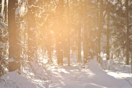 Snowy winter forest in the rays of the rising sun. Beautiful winter scenery.