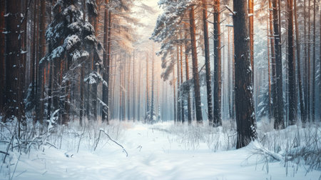 Tranquil snow-covered forest path with sunlight filtering through pine trees. That the image is generated using AI.