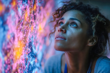 A woman's peaceful expression blends harmoniously with vibrant cosmic elements. The image captures the essence of tranquility and transformation, creating a captivating experience.