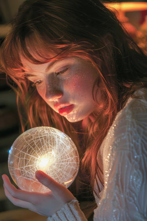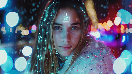 Virtual girl portrait with glowing garlands in hair, creating a captivating digital look