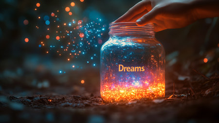 A woman's face glows with serene beauty as golden sparkles gently illuminate her features. Her eyes are closed, embodied tranquility in a peaceful atmosphere filled with soft, enchanting light.