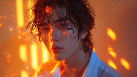 This enchanting portrait captures a young woman with vibrant light reflections, showcasing her beauty and serene expression against a dreamy backdrop.