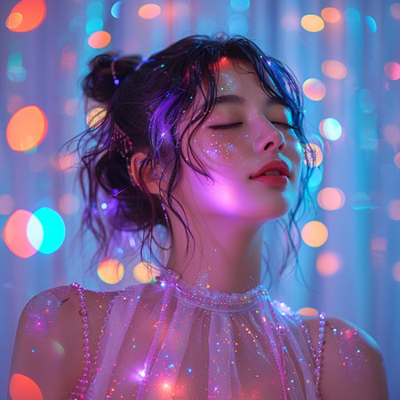 Holographic makeup glow under disco lighting aura effect closeup portrait colorful bokeh atmosphere