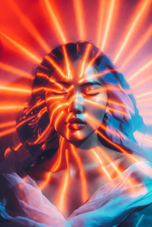 A tranquil woman with closed eyes is enveloped by swirling, neon-pink and blue light streams, creating a dreamy, ethereal fantasy scene of cosmic and spiritual energy.
