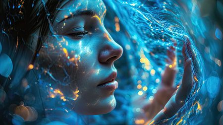 Fantasy portrait of a beautiful girl with blue lights on her face