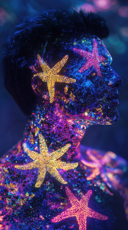 A portrait of an young woman with starry makeup sitting sadly in semi-darkness. Her face is illuminated with a pink glow, highlighting the woman's face, and creates a dreamy, melancholic atmosphere.