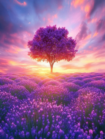 Purple Tree in Lavender Field Sunrise Peaceful Nature Scene sky art pink calm card image print image