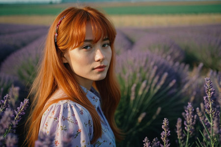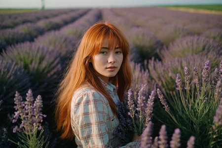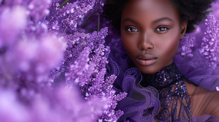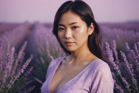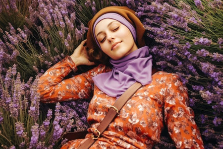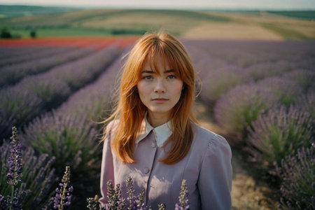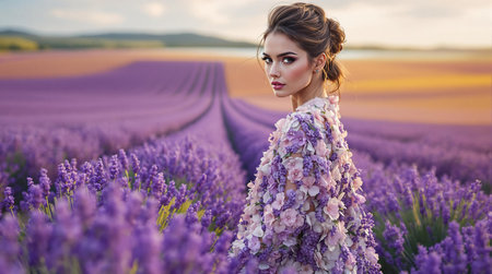 A connection to the earth, reflected by a figure in floral attire amidst sweeping lavender fields.