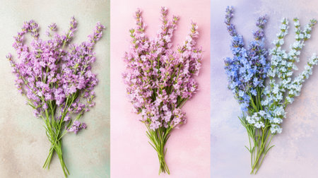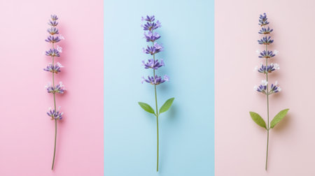 A beautiful display of lavender flowers stands against pastel backgrounds of pink and blue, showcasing their delicate petals and vibrant colors. Perfect for floral designs.