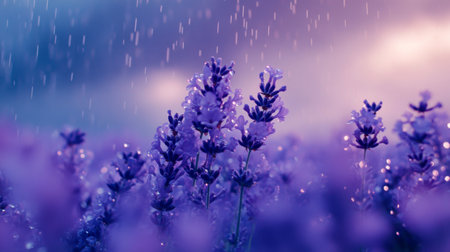 A serene lavender field under soft rain at dusk, showcasing vibrant purple flowers glistening with water droplets, creating a tranquil and beautiful natural scene.